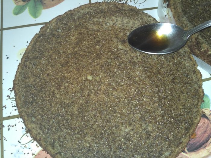 Коржи пропитываем сахарным сиропом (у меня со вкусом ирландского крема), можно заменить его другой пропиткой, которая вам нравится (например, крепкий чай, сахар и коньяк или ром).