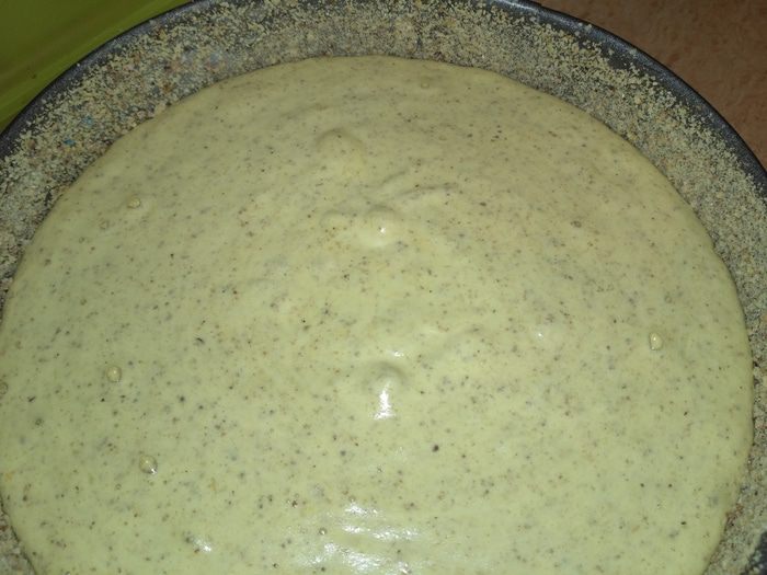 Вылить тесто в форму. Во время выпекания тесто не очень увеличится, поэтому форму можно брать и поменьше, тогда торт будет повыше. Выпекаем 40 минут при 180°С.