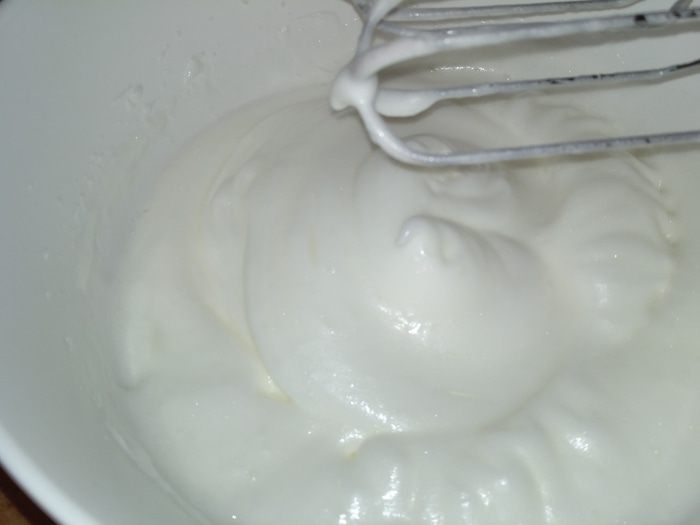К белкам добавить щепотку соли и начать взбивать. Взбивая, постепенно подсыпать сахар.