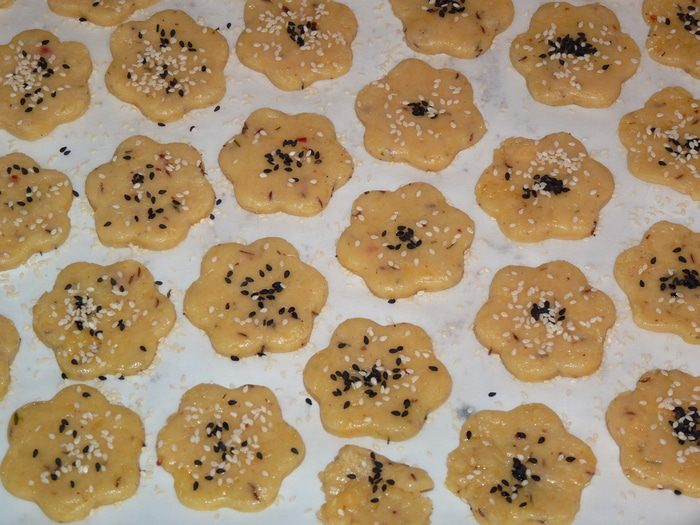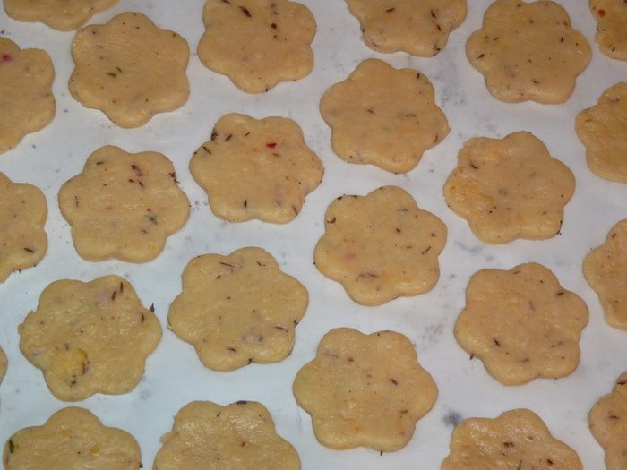 Охлажденное тесто раскатать в пласт около 0,5 см толщиной и формочками вырезать печенье (у меня получилось 30 штук).
