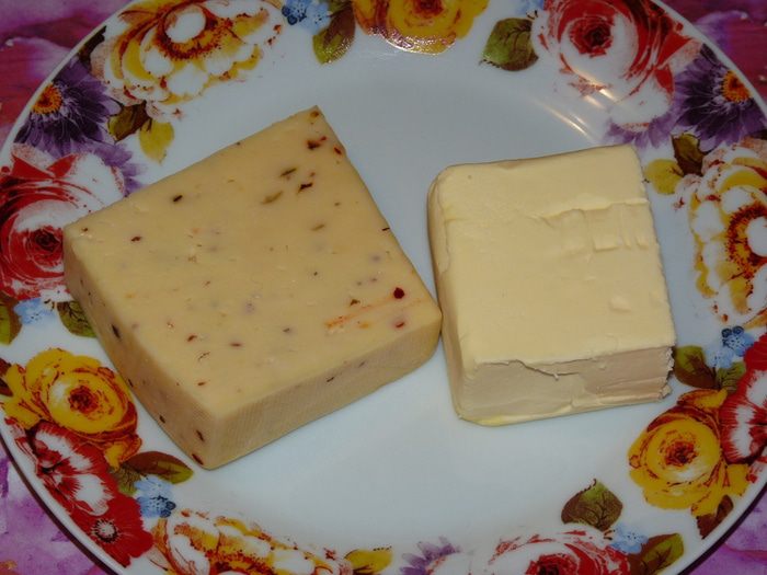 Сыр (у меня с томатами и травами) и холодное масло натереть на крупной терке.