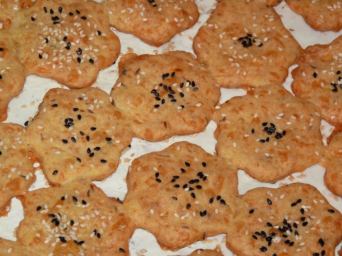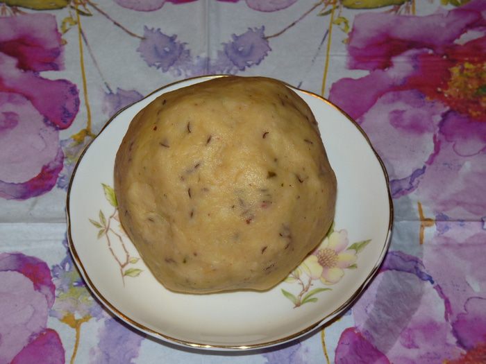 Добавить разрыхлитель, черный перец, травы, сливки и муку. Тщательно перемешать. Добавить тмин и замесить тесто. Солить не нужно, т. к. сыр уже содержит достаточно соли.