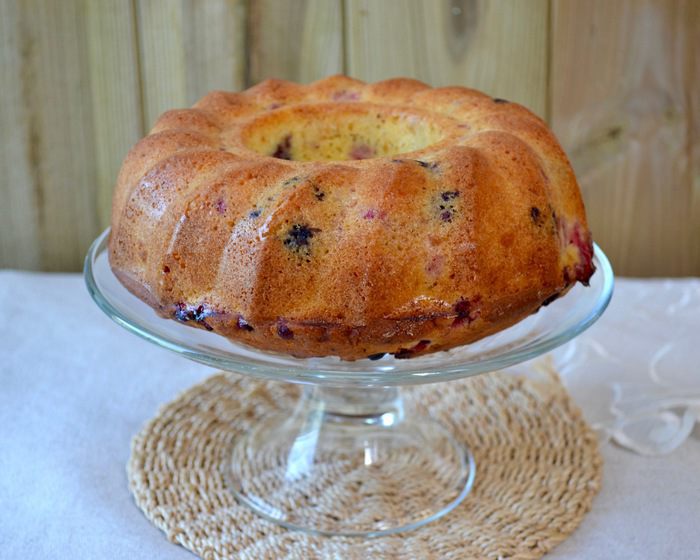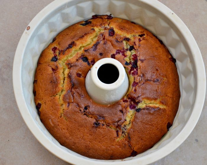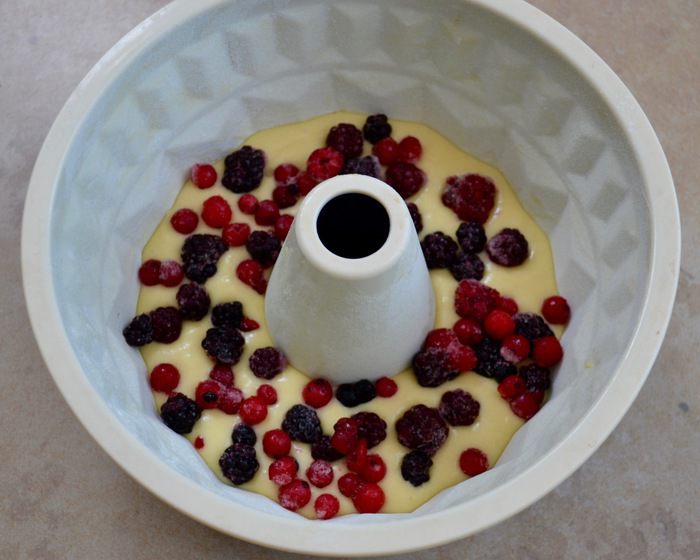 Половиной теста заполнить круглую форму для кексов (с тубой в центре) 20 см в диаметре. Поверх теста выложить половину от количества ягод. Выложить оставшееся тесто и сверху присыпать ягодами.