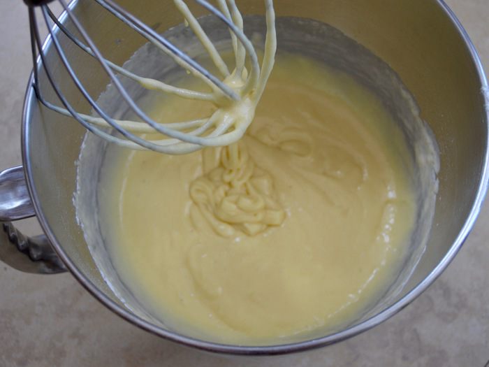 Яйца взбить с сахаром и щепоткой соли до пышности. Продолжая взбивать, влить понемногу сливки и добавить цедру лимона и имбирь (порошок). Добавить просеянную с разрыхлителем муку и размешать, чтобы не было комочков.
