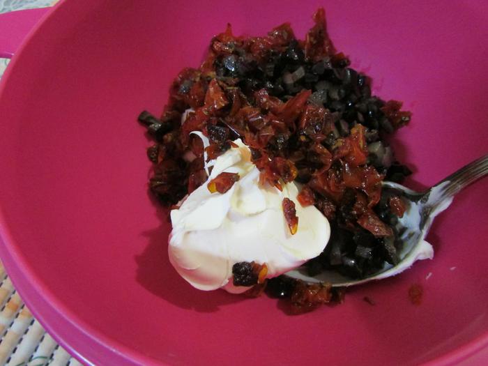 В миску положить маскарпоне, добавить томаты и маслины. И хорошо все перемешать.