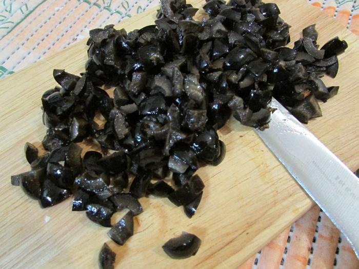 Маслины порезать небольшими кусочками.