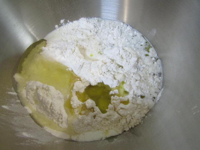 В чаше блендера соединить мучную смесь, яичный белок, оливковое масло, молоко, соль и сливки. Перемешать на минимальной скорости. А затем месить на максимальной скорости 5 минут. Замесить однородное тесто.