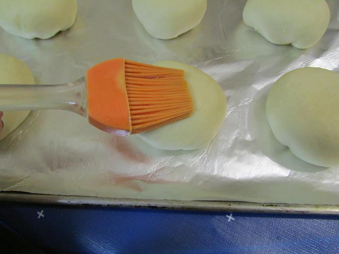 Яичный желток смешать с 1 столовой ложка молока. С помощью кулинарной кисти смазать булочки.