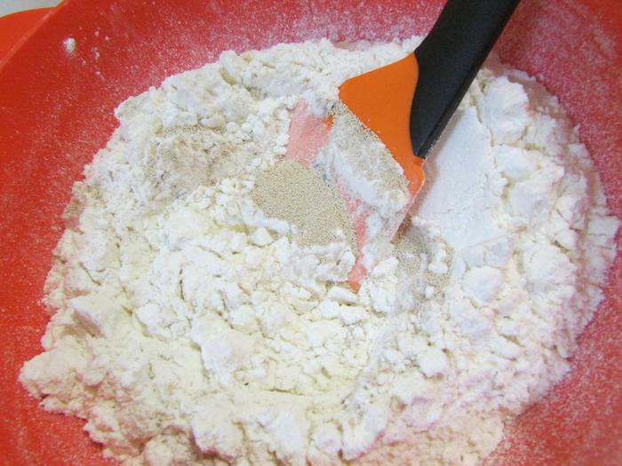 Муку просеять и хорошо перемешать с сухими дрожжами.