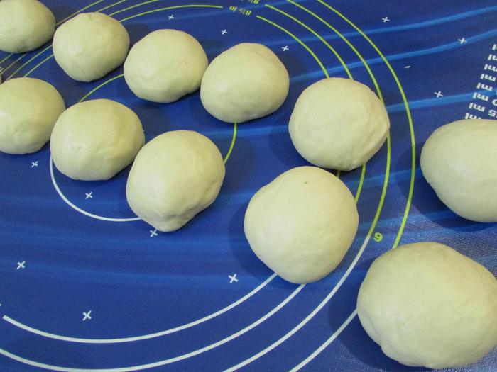 Когда тесто заметно увеличится, его хорошо обмять и разделить на 12 равных кусочка (у меня по 55 грамм). Из каждого фрагмента сделать шарик.