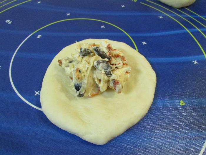 Завернуть (сделать это аккуратно и надежно, чтобы при выпечки начинка не вытекла) тесто так, чтобы вся начинка была закрыта. Выложить булочки на противень, застеленный пекарской бумагой.