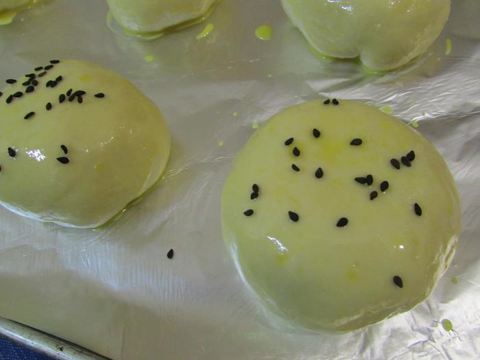 Затем булочки присыпать кунжутом или натертым на мелкой терке пармезаном. Булочки отправить в разогретую духовку до 180°С. Выпекать 20 минут. Готовые булочки извлечь из духовки. Перенести булочки вместе с пекарской бумагой на решетку. Дать остыть.