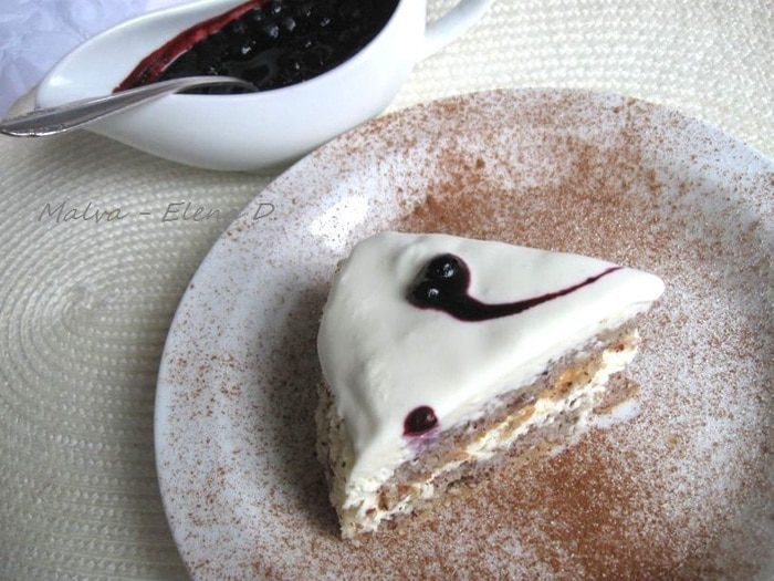 Соус. Кукурузный крахмал развести в соке, который образуется после разморозки ягод. В сотейник положить ягоды, сахар, ванильный сахар, сок лимона, содержимое 0,5 стручка ванили — соскрести мякоть стручка и семена, добавить разведенный крахмал. Поставить сотейник на огонь, немного проварить, помешивая, 1 минута после закипания. Охладить. Подать к торту.