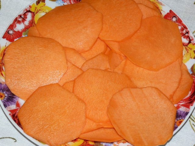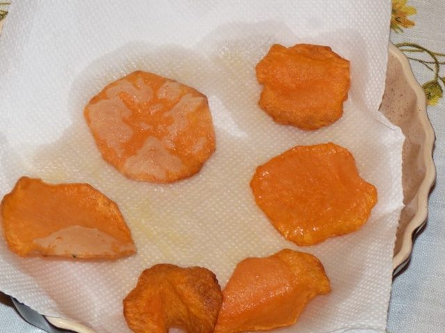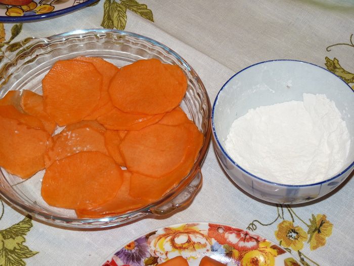 Тыквенные слайсы обмакнуть в смесь муки и крахмала. Жарить на раскаленном масле с двух сторон. Выложить на бумажное полотенце, чтобы впитался лишний жир.