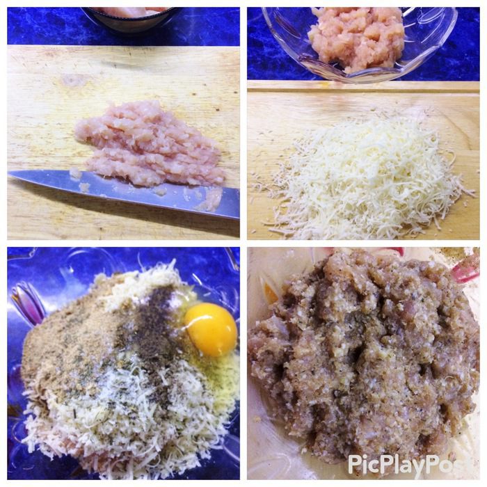 Куриное филе можно измельчить при помощи блендера, я же порубила ножом. Натереть сыр на мелкой терке.