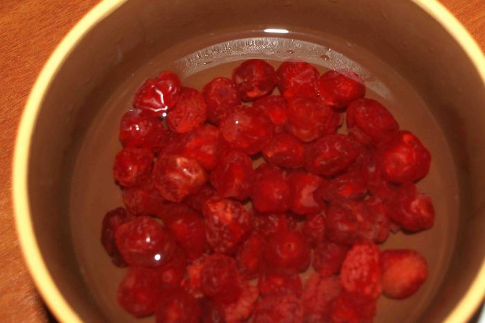 Вишню заливаем горячей водой и оставляем на 15 минут.