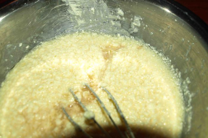 Взбиваем масло с яйцами, добавляем десертное вино (у меня мускат) и взбиваем еще раз.
