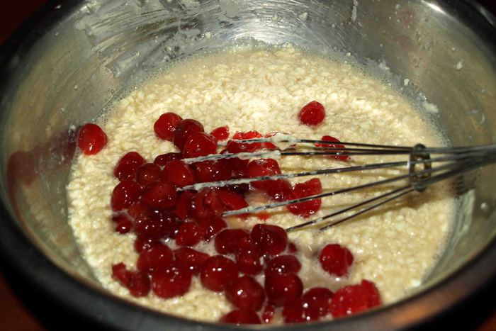 С вишни сливаем воду, отжимаем. Вишню можно добавить целой, можно разрезать на две половинки.