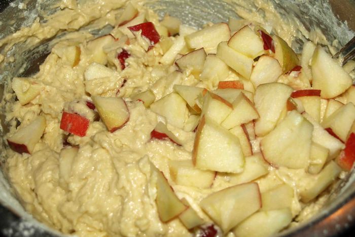 Яблоки не крупно нарезать и добавить в тесто. Хорошо перемешать.