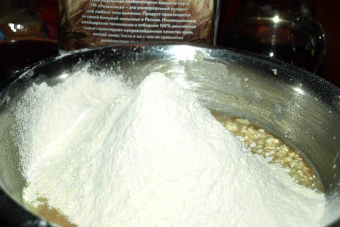 Добавляем просеянную муку, разрыхлитель и перемешиваем.