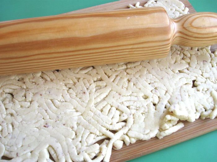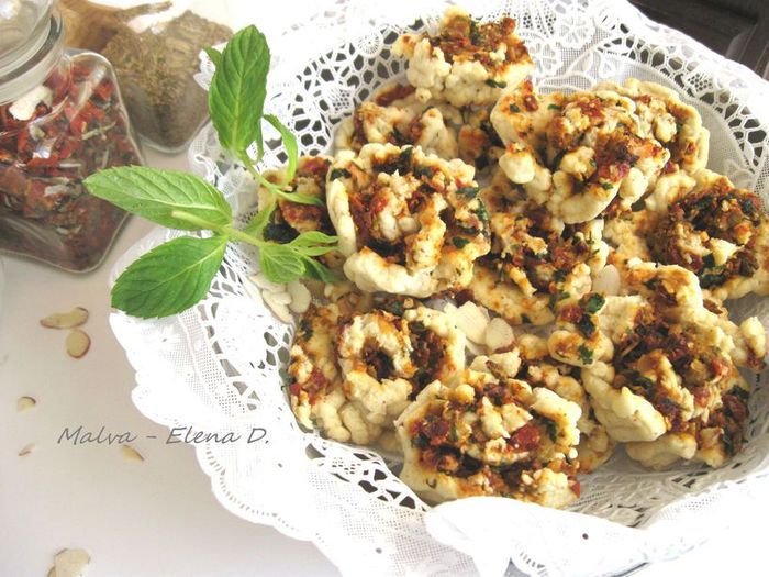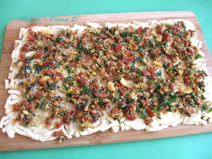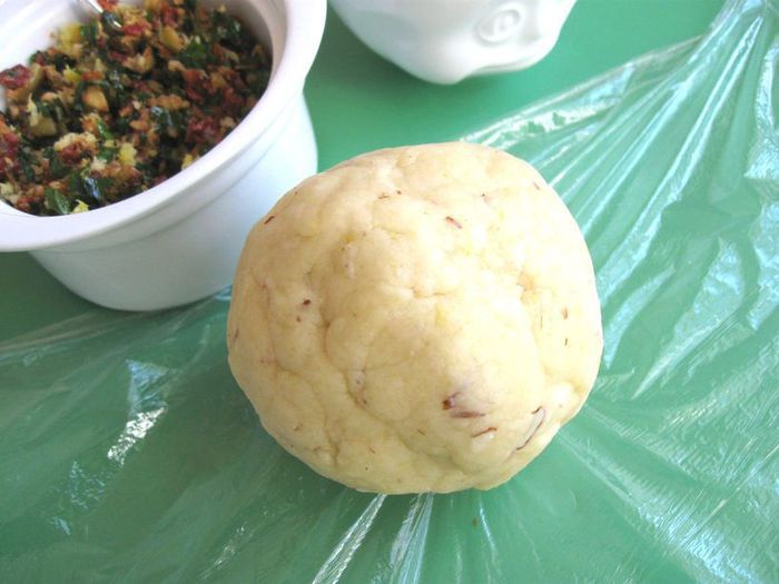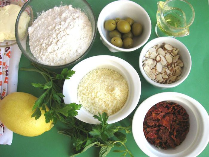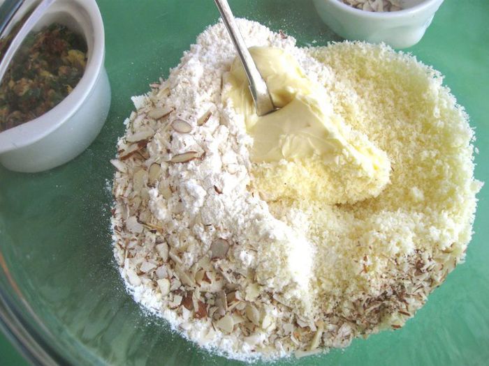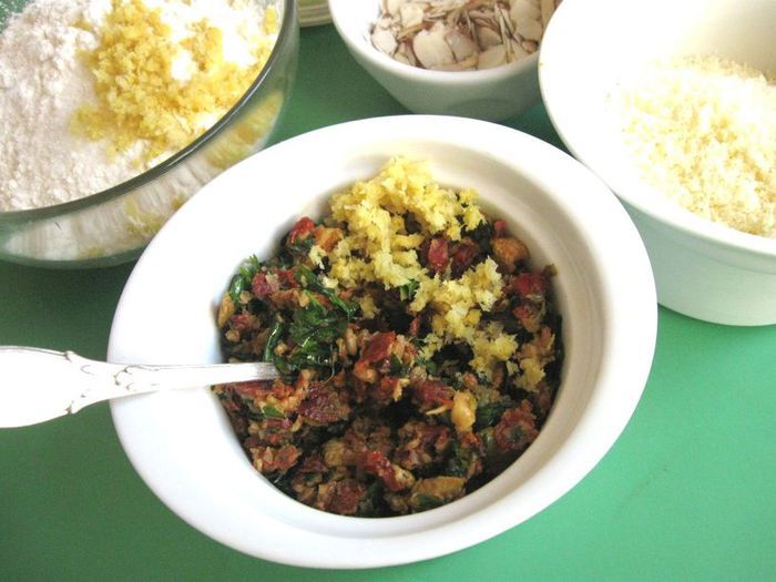 Цедру натереть на терке. Приготовить песто. Я использовала ступку. Зелень измельчить, соединить с солью (половиной указанного количества), перцем, половиной миндальных лепестков, сухими хлопьями помидоров, оливковым маслом, зелеными оливками, очищенным и нарезанным чесноком. Потолочь. Половину цедры добавить к смеси, перемешать.
