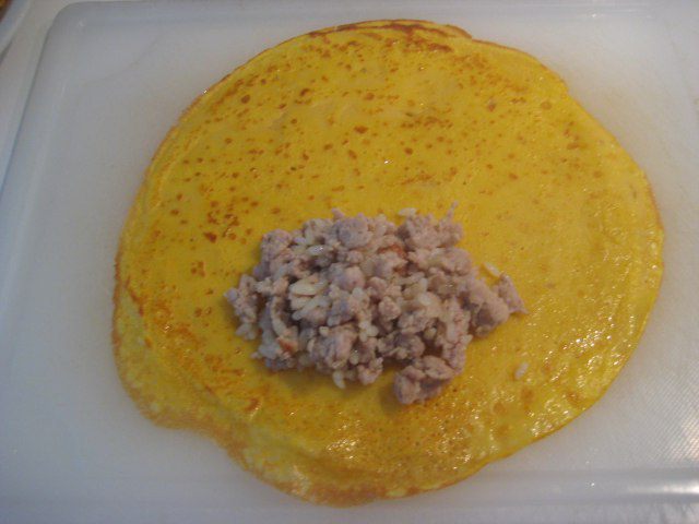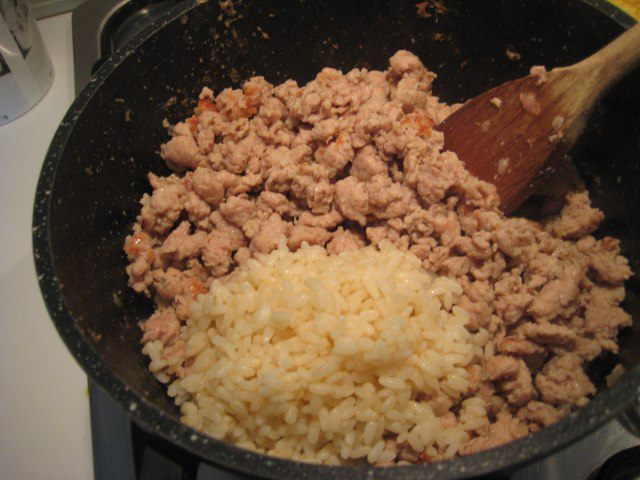 Начинка: обжарить на растительном масле лук до прозрачности. Добавить фарш (у меня домашний свинина+курица), обжарить до готовности, посолить, поперчить, добавить отварной рис. Перемешать начинку.