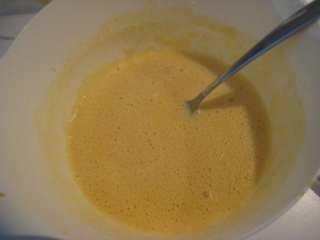 Тесто: яйца взбить с солью, добавить муку и крахмал, перемешать. Добавить тыквенное пюре и молоко, перемешать до однородности. Влить масло.