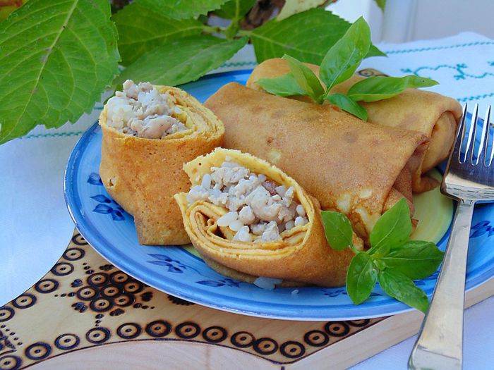 Вкусные блинчики с осенней красавицей тыквой и начинкой из фарша и риса.