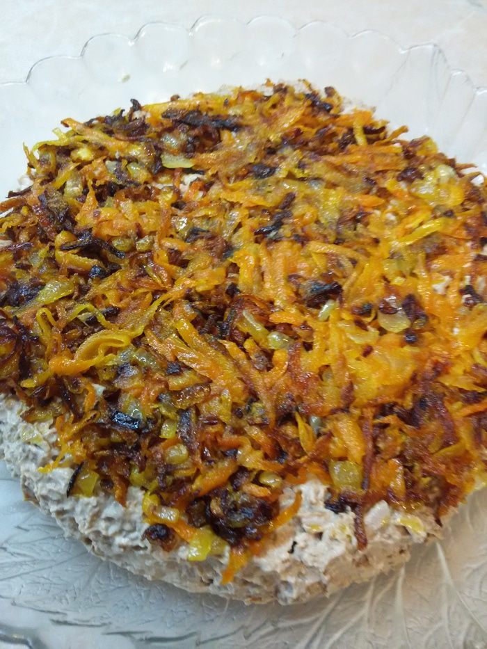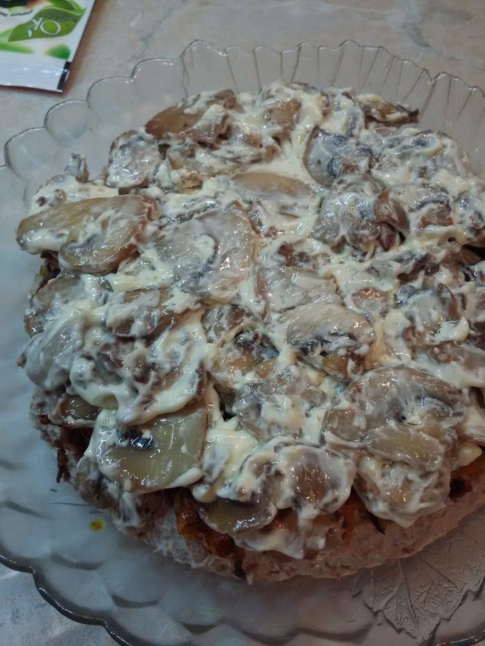 Шампиньоны смешать с майонезом. Но добавлять немного, т.к. грибы и так готовились на масле. Выложить их сверху моркови и лука.