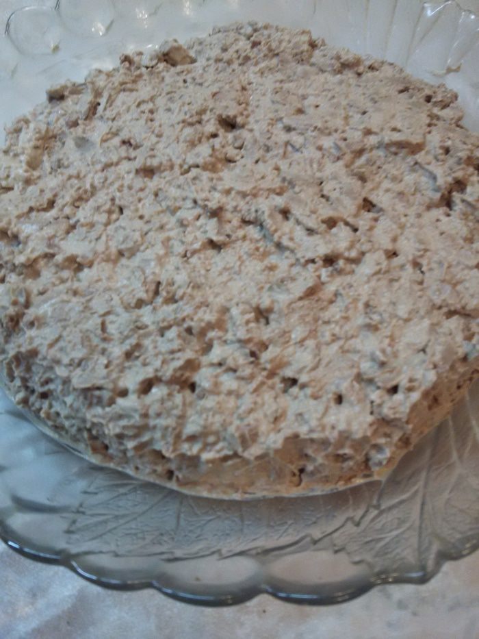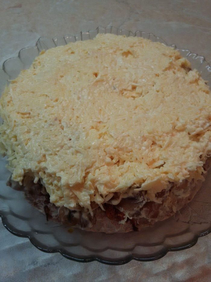 Когда все продукты готовы, можно начинать собирать салат. Печень перемазать с майонезом и выложить на блюдо ровным слоем.