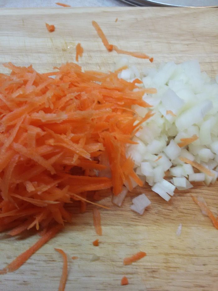 Лук нарезать мелкими кубиками, а морковь натереть на крупной терке. Все обжарить до готовности.
