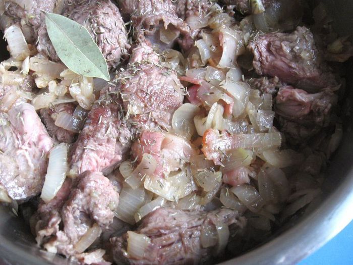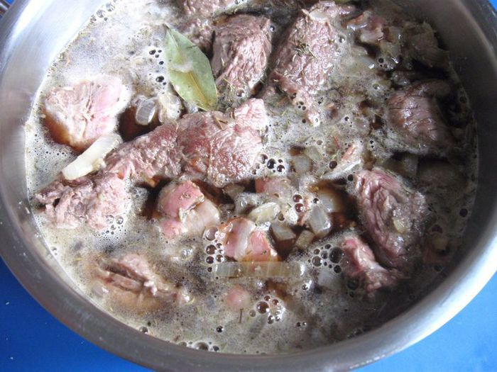 Переложить мясо из сковороды в теплоемкую кастрюлю с толстым дном. Посолить, поперчить, добавить тимьян, лавровый лист.