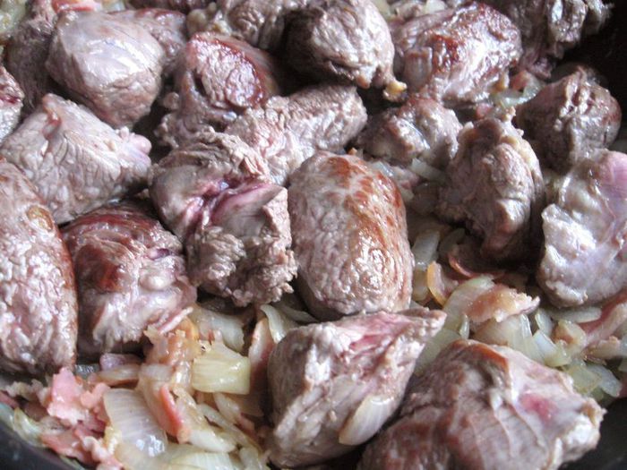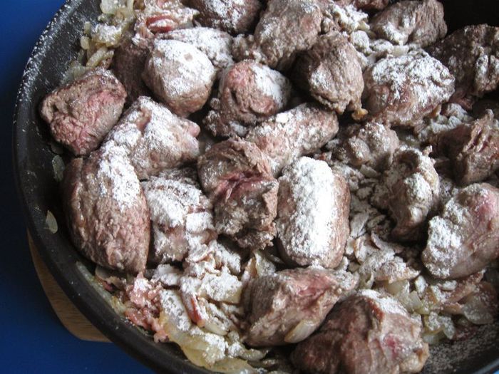 Соединить содержимое двух сковород: той, где находится лук и бекон, и той, где находится мясо, присыпать мукой.