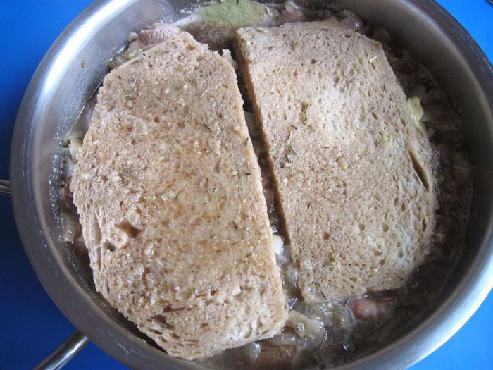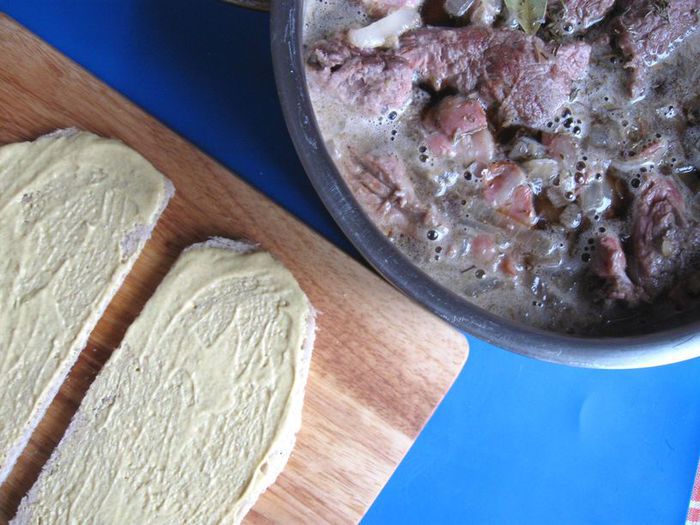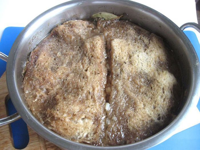 Положить их сверху мяса горчицей вниз, кусочки хлеба немного притопить. Накрыть кастрюлю крышкой. Поставить в духовку, убавить градус духовки до 160 — 150°С. Оставить в духовке мясо на 3 часа.
