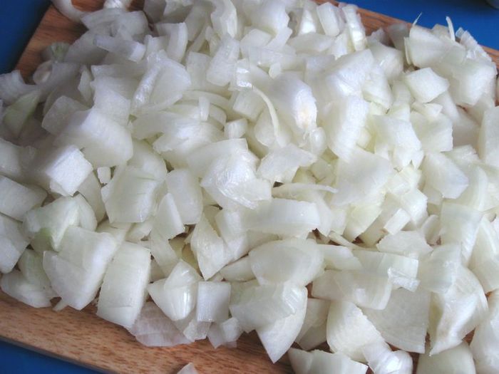 Лук (его должно быть много, он составляет примерно половину от количества мяса) и чеснок почистить, лук нарезать мелко, чеснок выдавить через пресс (можно тонко нарезать).