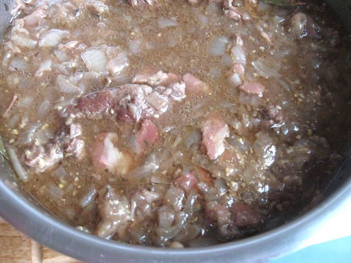 Духовку разогреть до 170°С. Налить в кастрюлю пиво (лучше взять темное пиво ) таким образом, чтобы кусочки мяса были погружены не полностью, мясо еще даст сок.