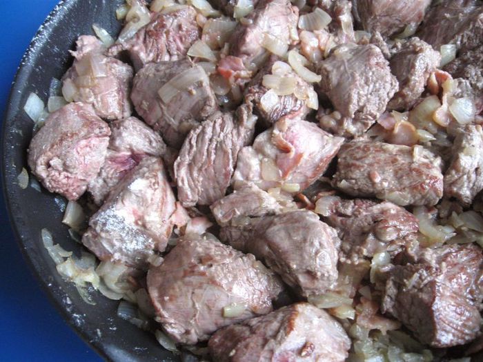 У меня получилось после разделки 1040 грамм мякоти говядины. Нарезать кусочками чуть меньше спичечного коробка.