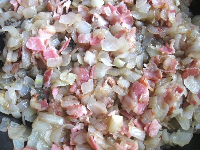 Бекон нарезать, обжарить отдельно от лука с 1 ч. л. оливкового масла. Соединить бекон с луком.
