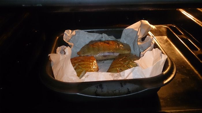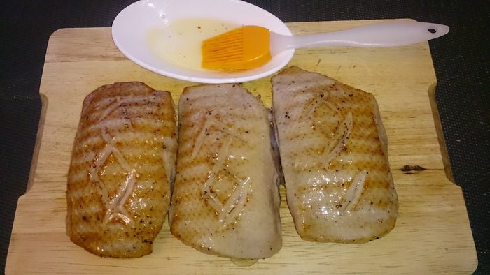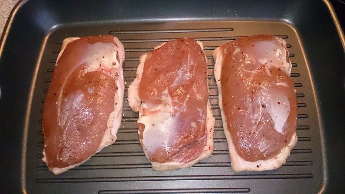 Обжариваем на сковороде-гриль кожей вниз до хрустящей корочки.