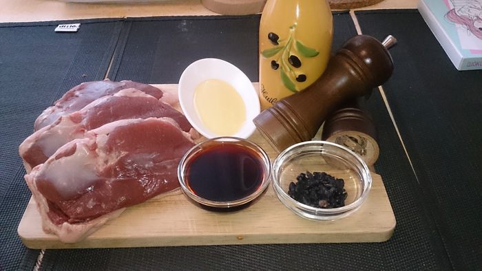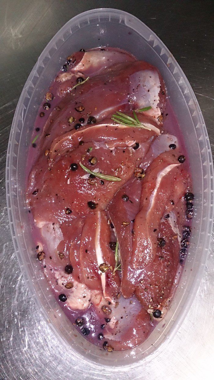 Моя любимая девушка давно пристает ко мне по поводу утиной грудки. Любит она ее очень! Вот я и решил в выходные ее побаловать! Набор продуктов небольшой, собственно, сама утиная грудка и для маринада: красное сухое вино, сушеные ягоды можжевельника, свежий розмарин и жидкий мед.