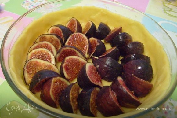 Инжир разрезать пополам, обмакнуть срезом в сахар и выложить на миндальный крем срезом вверх. (Фото не совсем соответствует описанию. Просто готовила два раза: один раз инжир был на основе и под франжипаном, другой — инжир сверху. Второй вариант понравился больше).