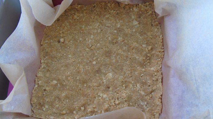 Печенье перебейте в крошку, добавьте растопленное сливочное масло и масло грецкого ореха Biolio. Форму 20х20 выложите пергаментом и утрамбуйте начинку. Отправьте выпекаться на 10 минут в разогретую до 200°С духовку.