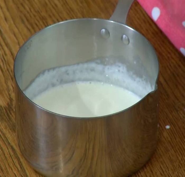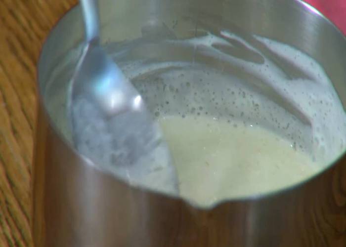 В небольшую кастрюлю влить 50 мл сливок и прогреть на медленном огне, но не кипятить.