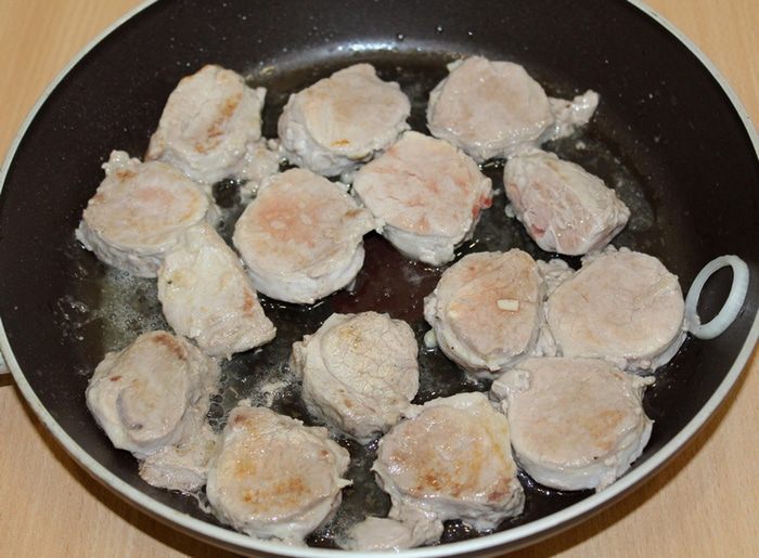 Свинину обжарить, до румяной корочки и убрать на тарелку.