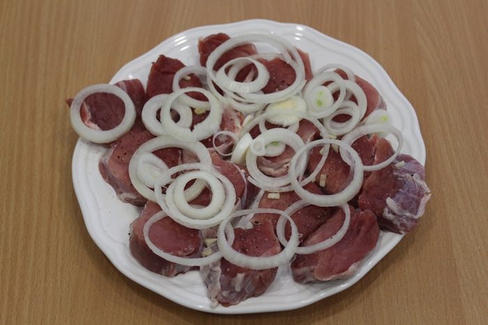 Свинину нарезать небольшими кусочками, слегка отбить. Чеснок мелко порезать, лук нарезать кольцами. Сложить все на тарелку, посолить, поперчить. Закрыть крышкой и убрать в прохладное тесто на 1 час.