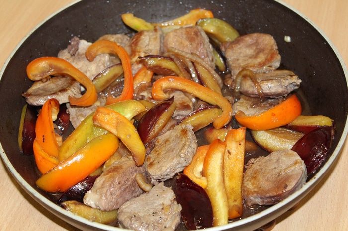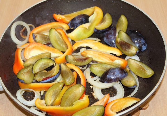 В этой же сковороде подрумянить лук, добавить перец. сливу, готовить 3 минуты.