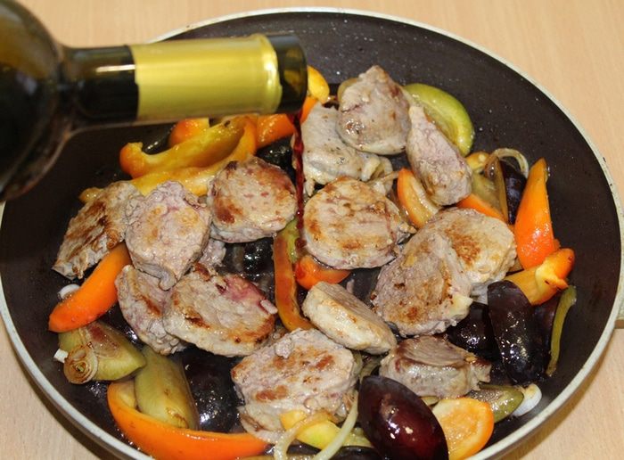 Вернуть в сковороду мясо, залить вином. Посолить, поперчить по вкусу.