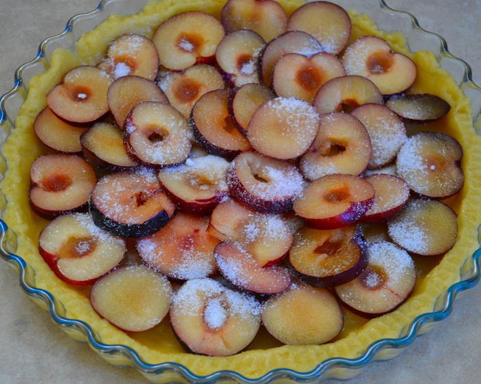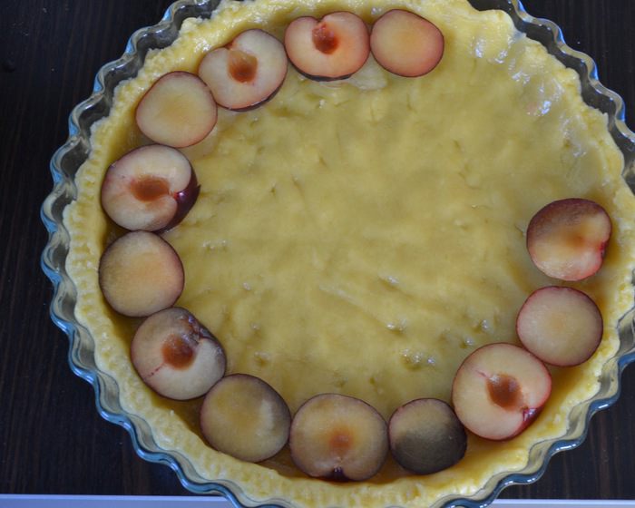 Сливы разрезать, удалить косточки и разложить по тесту.