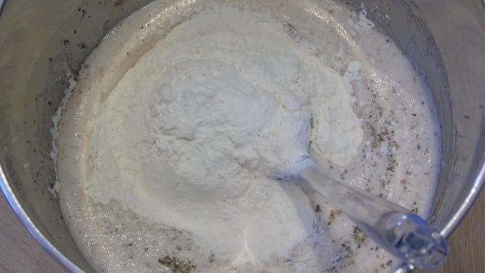 Муку просейте с разрыхлителем и добавьте в тесто, перемешайте.
