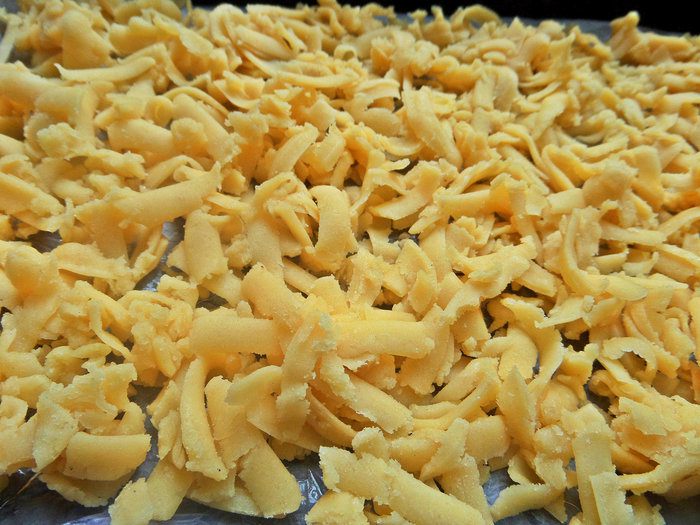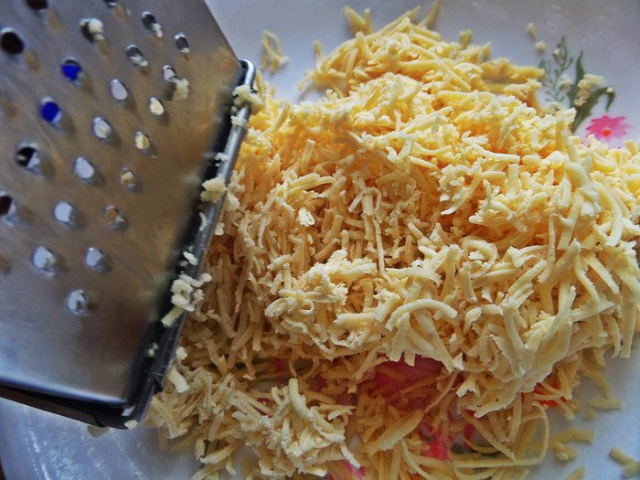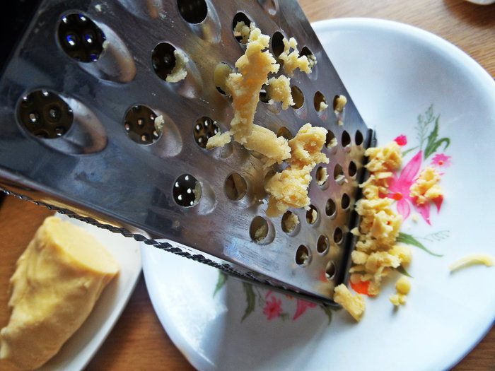 Большой кусок теста тут же натираем на крупной терке.